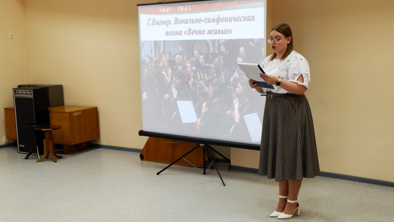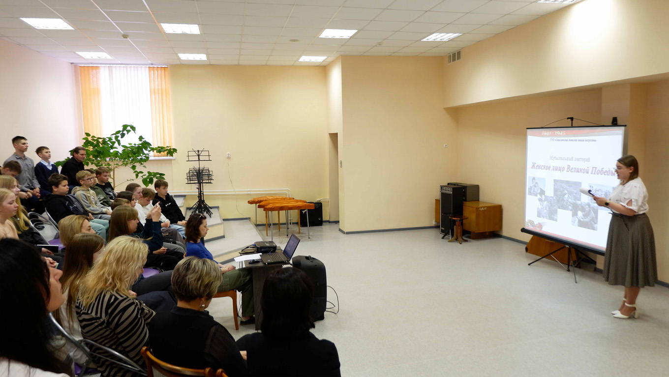 Ведущая Тайкевич А.Ю. познакомила ребят и педагогов с героинями опер, кантат, поэм, бесстрашными женщинами, которые наравне с мужчинами ковали победу на фронте и в тылу. Они были санитарками, спасая жизни на передовой, отважными летчицами, разведчицами, партизанками…